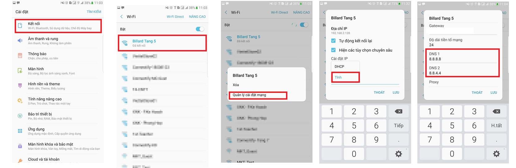 Bước 4: Sau đó kéo xuống dưới chọn DNS Google 8.8.8.8, 8.8.4.4 sau đó thoát ra ngoài
